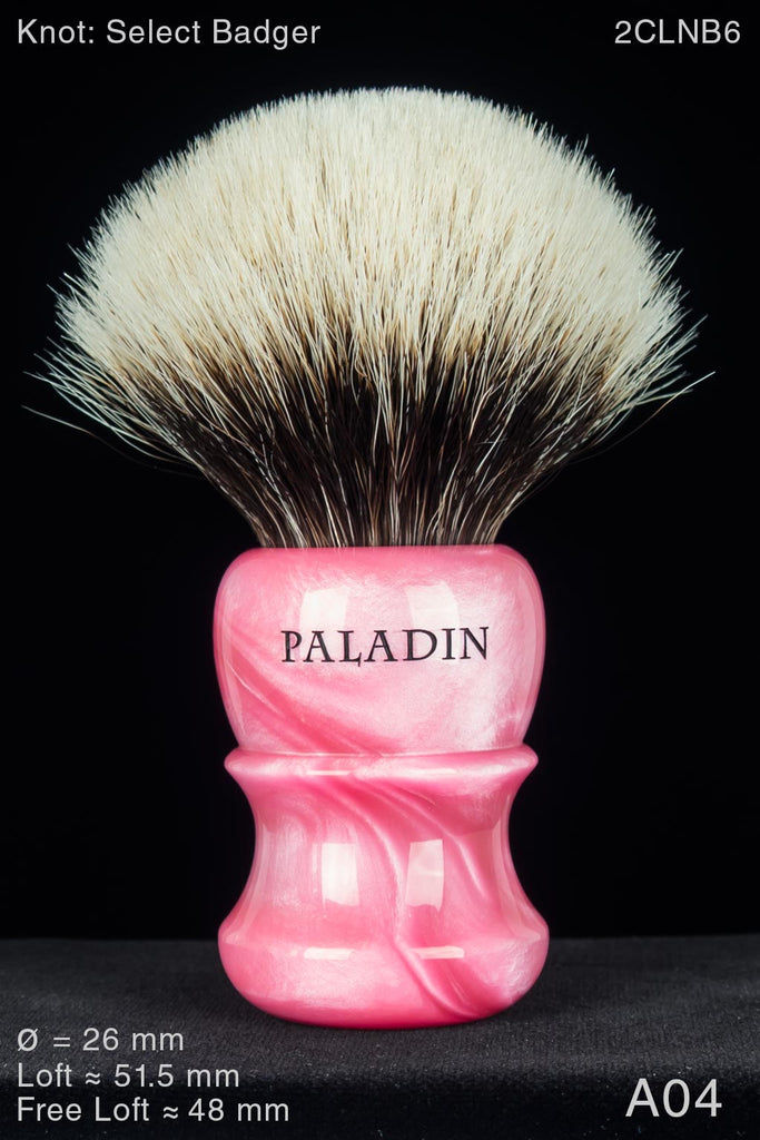 The Paladin™ PK-47™ handle embodies an original design, although it appreciatively reflects traditional influences. The concave section below the ring (or bead) is slightly more open than that of the Chief™, and the PK-47 has just a bit more girth. We were honored by a request to make 100 PK-47s for The Shave Nook’s third anniversary (2015), limited-edition brush. It was enthusiastically received; that offering sold out in 97 seconds. This is a nicely balanced brush. At about mid-size in height, the PK-47 serves bowl and face-lathering equally well, at least in our use.