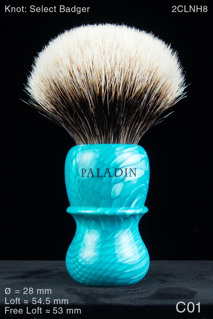 The Paladin™ Chief™ handle-design reflects traditional influences that proximately include the Morris & Forndran L7 and several timeless Simpson models (notably including the venerable M7 and AS3), which themselves have antecedents in US-made Rubberset shaving brushes dating to the early 1900s. The basic shape has been around for a long time (probably because it was easy to produce on primitive lathes, looks good, and works quite well). Our design objectives for the Chief aimed to achieve subtle yet distinctive aesthetic and ergonomic refinements. This brush is especially well-suited to bowl-lathering, but it also works just fine for face-lathering.