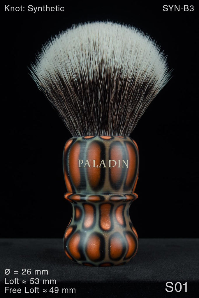 We introduced the first Paladin shaving brushes made with synthetic knots in September of 2020. Those knots were designated as either 3SSBA7s (all 3-band semi-bulbs) or 3SHYH7s (all 3-band hybrids).  We subsequently commissioned the production of knots made with structurally similar synthetic fibers but simulating the appearance of 2-band badger hair. Those third batch knots are associated with the simplified code SYN-B3. We plan to carry forward that format (i.e., B3, B4, B5….) in assigning codes to synthetic knots in the future. Although we believe it’s unlikely that synthetic fibers will ever fully mimic the characteristics of badger hair, significant progress in that direction has been made over the past several years, and the fact is that synthetic knots can fairly be claimed to offer functional advantages as compared to knots made with badger hair. We will continue to strive for improvement as opportunities arise.