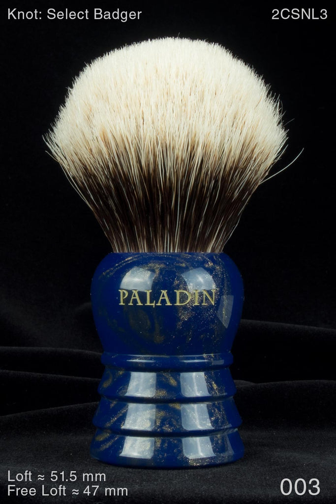 A very good friend in San Francisco (whom we met on the wet-shaving boards) suggested making a handle based on an old Made-Rite shape that appeared in several variants around mid-last-century. He loaned us two examples, which we blue-printed. Those drawings were very useful as references, but the project ultimately required making a fresh start from scratch on a clean page. The design that ultimately resulted clearly reflects its Made-Rite antecedents, yet it also turned out to be substantially original. The shape is solidly functional and ergonomic. The Buck takes a bit of extra work to finish, but is well worth the effort. The Paladin® Buck Rogers™ shaving brush is a blast from the past that should serve bowl and face lathering just about equally well.